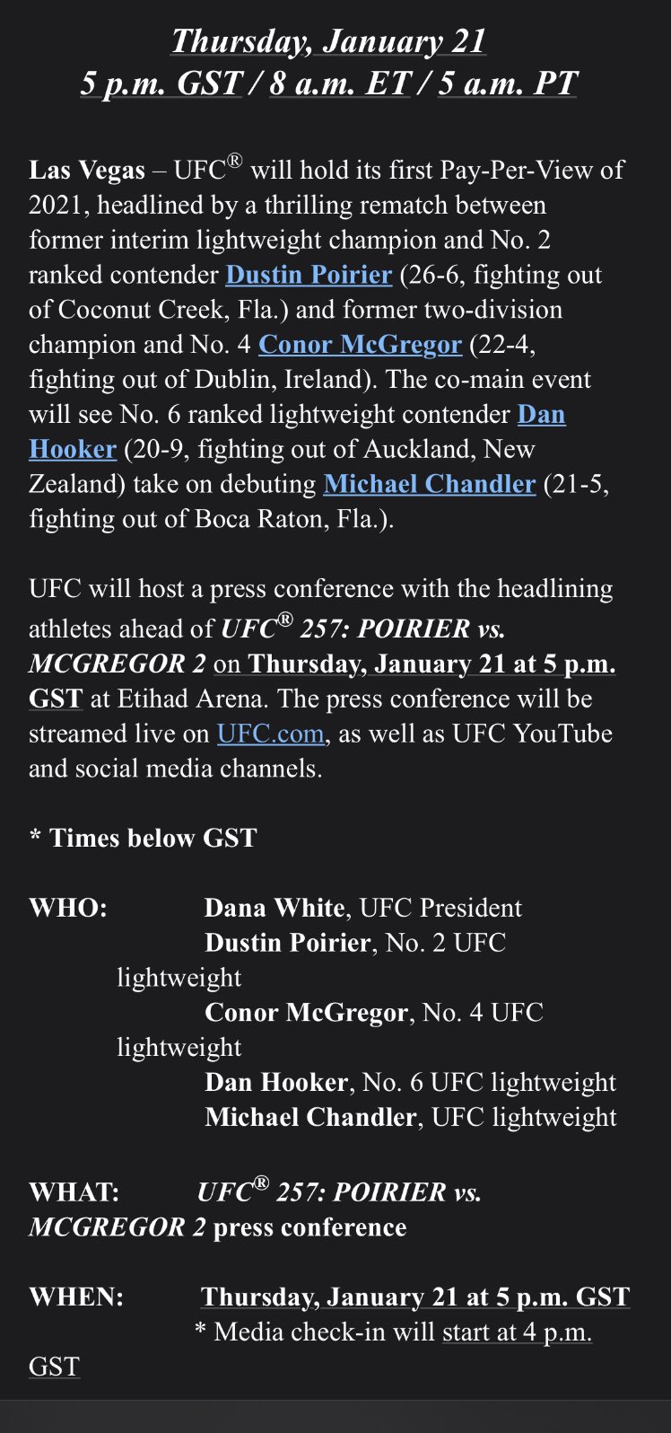 Exactly three weeks ahead of the ufc 257 rematch between dustin poirier and conor mcgregor, it's time to relive the first fight in full. Mcgregor is scheduled to make his ufc return on january 23, 2021, at ufc 257. Conor mcgregor forecasts ko of dustin poirier 'inside 60 seconds' at ufc 257. Khabib and his father, abdulmanap : The rematch has been finalised and will headline ufc 257 on 23 january. Ufc 257 has been scheduled for jan. Perez on 11/21 at a special start time of 2pm/et on fight island ufc 255 live stream #ufc255 boxing. The irishman, currently ranked no 4 in the lightweight division, knocked out poirier, who is ranked no 2, back in 2014 at ufc 178. The notorious returns to the octagon once again. Poirier vs mcgregor 2 on saturday, january 23rd. The ufc releases trailer for dustin poirier vs. Tristen critchfield it appears that mystic mac has returned ahead of his headlining matchup with dustin poirier at ufc 257. Moreno, the ufc capped its final major event of 2020 with a look at ufc 257: You can watch conor mcgregor vs dustin poirier 2 ufc 257 full card without signing up to a contract. Ufc fight island 7 talent media day video. Exactly three weeks ahead of the ufc 257 rematch between dustin poirier and conor mcgregor, it's time to relive the first fight in full. Участники, кард и результаты ufc 257. According to multiple sources speaking to mma fighting, both mcgregor and poirier have come to terms on a deal to book the lightweight fight for the upcoming ufc 257 card on jan. 23, 2021 and the main event is expected to feature a great lightweight bout between conor mcgregor and ufc 196: Conor mcgregor against dustin poirier 2 has been confirmed by the ufc. Dan hardy breaks down conor mcgregor vs. Dustin poirier rematch at ufc 257. It culminates with ufc 257: Etihad arena, yas island, abu dhabi, united arab emirates organization: Ufc· january 2, 2021 1:25 pm · by: Regular subscribers can also stream matches website or sport app on a variety of devices including laptops how to watch conor mcgregor vs dustin poirier 2 live online from anywhere. Shortly after the conclusion of ufc 256: 12 date now that nunes vs anderson has been scrapped for the main event at ufc 256. Pagesbusinessessports & recreationsports leagueufcvideosufc 257: Mcgregor 2 is an upcoming mixed martial arts event produced by the ultimate fighting championship that will take place on january 24, 2021 at the etihad arena on yas island. 7:00 pm pst check ufc 257 local time and date location: